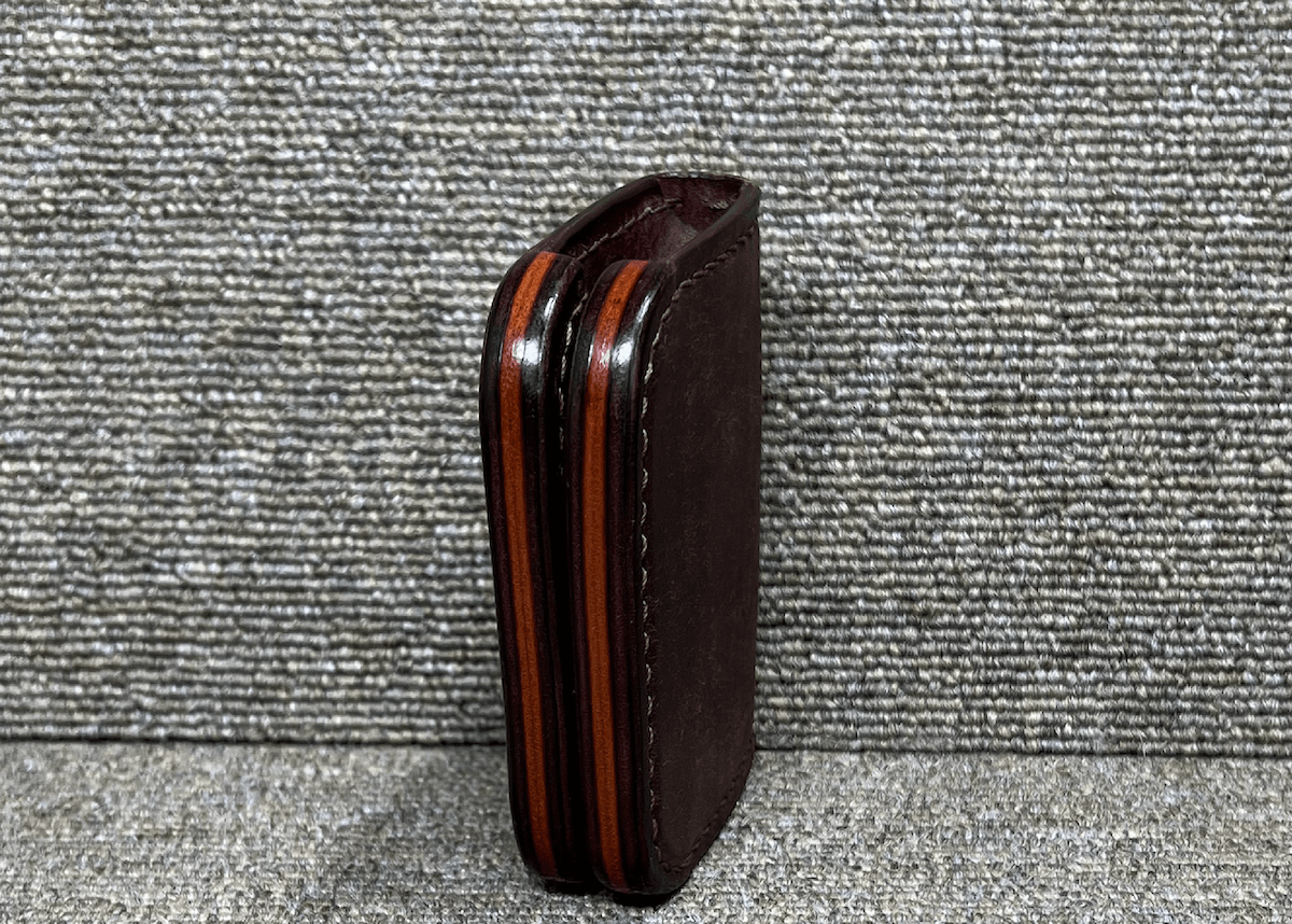 革の美しさを最大限に引き出すため、特にコバの厚さにこだわっています。見栄えが良く、艶があり、高級感が漂う製品が完成します。
